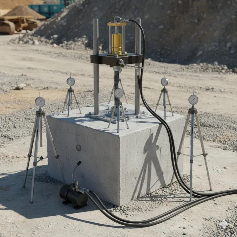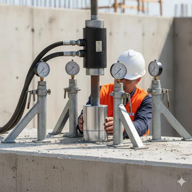 Esse teste de campo verifica a capacidade de resistência à tração dos chumbadores instalados no solo ou na rocha, assegurando que possam suportar as cargas de projeto previstas.